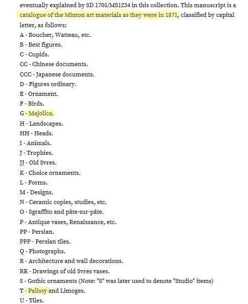 “Thus, what today we call majolica is in most cases what Minton, and Arnoux, referred to as Palissy ware.” Dictionary of Minton[8]