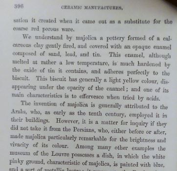 On page 396 he continues in the same vein with a description of tin-glaze majolica, their own English version, which they named ‘Majolica’