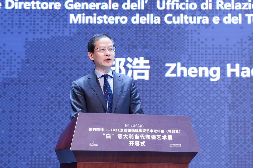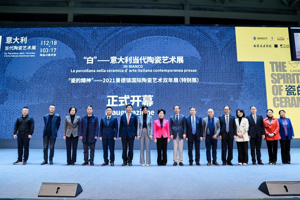 On Mar 2, 2022, White - Contemporary Italian Ceramic Art Exhibition, as a special exhibition of Spirit of Porcelain - China Jingdezhen International Ceramic Art Biennale 2021(CJICB), held in Taoxichuan Ceramic Art Avenue, Jingdezhen, China. The exhibition is one of the activities of the Year of Culture and Tourism of China and Italy. Hu Xuemei, deputy secretary of Municipal Party Committee and mayor of Jingdezhen, Zheng Hao, vice leader of the Bureau of International Exchange and Cooperation of the Ministry of Culture and Tourism of China, Lucia Pasqualini, Consul General of Italy in Guangzhou, Li Liangzhi, secretary of the Party Committee of Jingdezhen Ceramic University(JCU) and Huang Xiaohua, vice general manager of China Arts and Entertainment Group Ltd. attended the opening ceremony and delivered speeches. Massimo Isola, mayor of Faenza, Italy, president of the Italian Ceramic Cities Association and chairman of European Ceramic Road and Matteo Zauli, curator of exhibition and director of Museum Carlo Zauli, attended the ceremony and delivered speeches at online meeting room in Italian branch. Gao Xiaoyun, vice mayor of Jingdezhen, LV Pinchang, deputy secretary of the Party Committee and vice president of JCU and LV Jinquan, member of the Party Committee and vice president of JCU attended the ceremony. Zhang Xiuzhong, president of Zhong Art International S.r.l. and executive curator attended the activity in Italian. Liu Zili, deputy director of the Management Committee of Jingdezhen National Ceramic Culture Inheritance and Innovation Experiment Zone, hosted the ceremony.