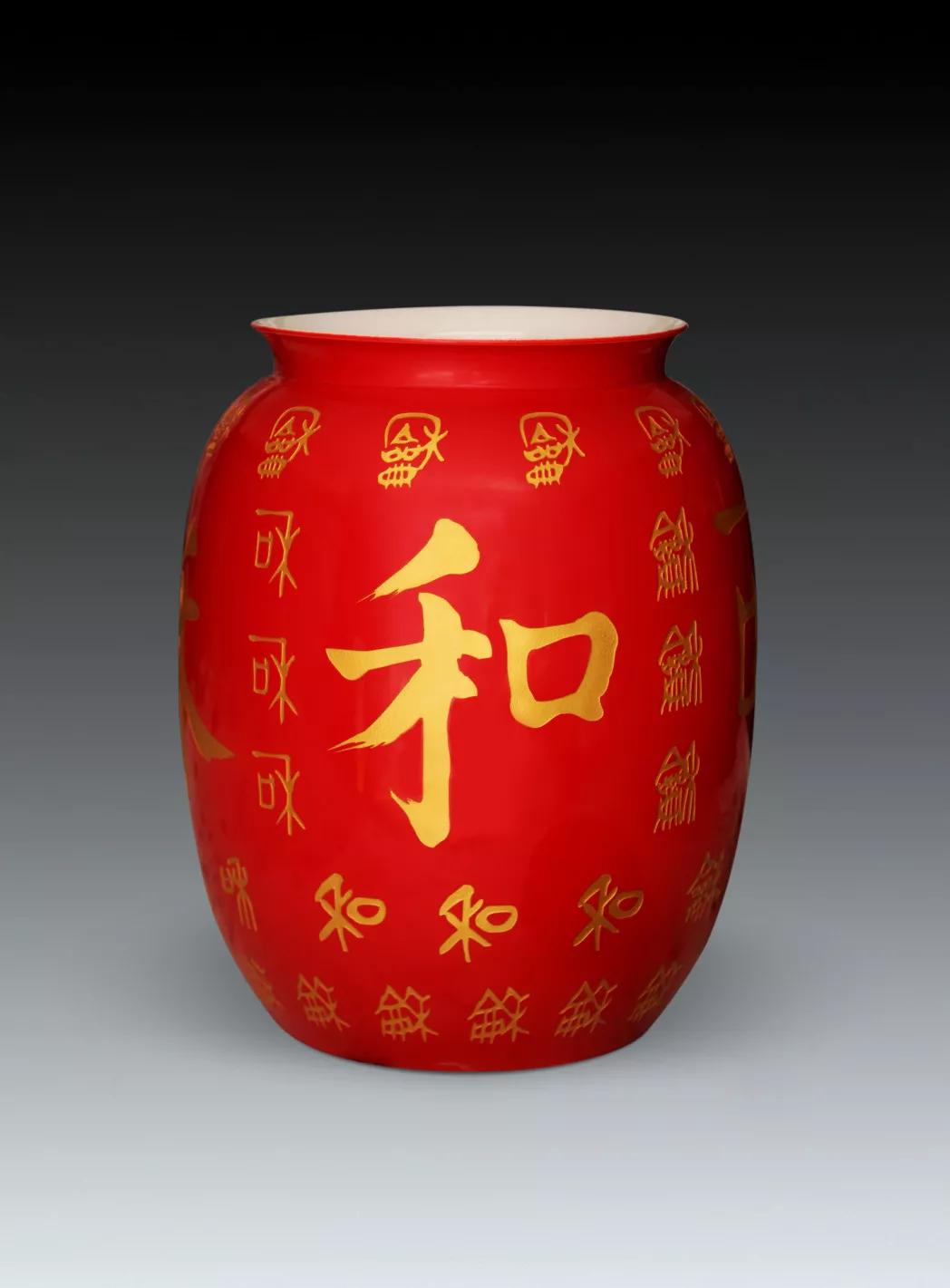 中国红釉書法雕刻金字《世博和瓶》瓷瓶(高49cm口径26cm)