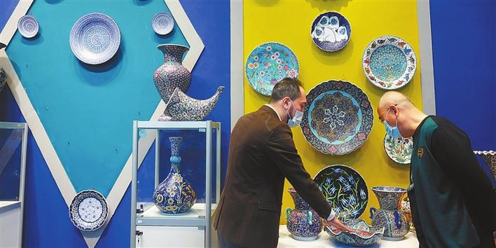 A Turkish exhibitor (L) introduces exhibits to a visitor at the 2021 China Jingdezhen International Ceramic Fair in Jingdezhen, East China’s Jiangxi Province, on Oct. 18. Photos by Xinhua