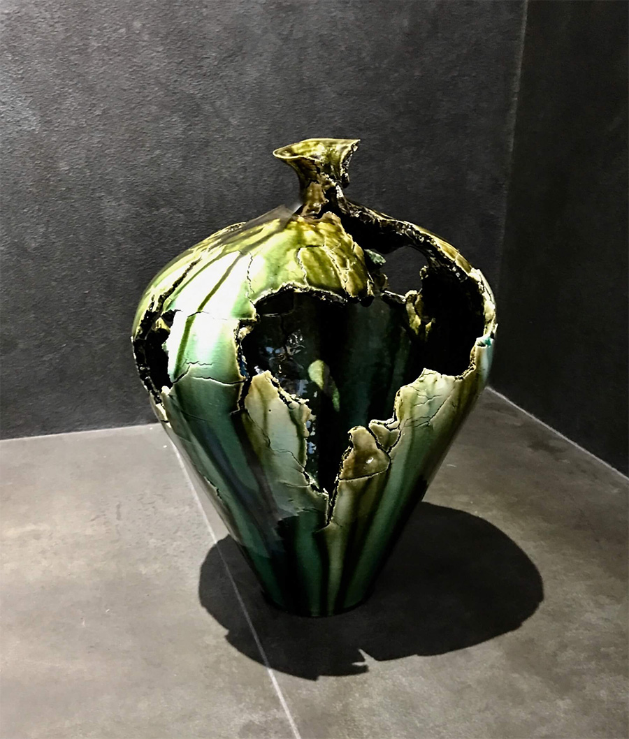 Makoto Yamaguchi was born in Seto (mid-western Japan) in 1978. Yamaguchi is the sixth-generation potter as his ancestor started his kiln in the 19th century. After traveling to East Asia and Europe, he launched his kiln in 2004. He has created Oribe, Shino and Seto wares, and has held a number of exhibitions at top art galleries in Japan. He won prizes at the Tokai Traditional Ceramic Art Award (2007), the Japan Traditional Ceramic Art Award (2007), the Seto City Art Award (2007), the Asahi Ceramic Art Award (2008), and the Seto City Art Award’s Mayor Award (2008). Yamaguchi particularly explores Oribe and Shino wares, which have a history of about 400 years. He has a reputation for his elegant Shino bowls and decorative Oribe bowls and flower vases. He is regarded as one of the most prospective mid-career ceramic artists in Japan. Oribe ware was developed in the 16th century as tea ceremony ware, such as tea bowls, flower vases and water jugs. Unlike the previously popular tea ceremony ware, which was characterized by simplicity, rusticity and naturalness in the early 16th century, Oribe ware was rather decorative, ornamental and novel in design. Shino ware was developed in the 16th century in the mid-Japan region, which was a center of Japan’s ceramic art industry then. It is made of local clays and feldspathic glazes. The range of products includes tea bowls, water jugs, bowls and dishes. White Shino, which has painted patterns or designs on it, is particularly popular.