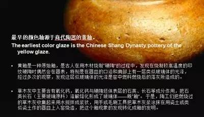 Chineseancient pottery workers in the burning of the Tao, the firewood formed on theformation of dust on the pottery, because the high temperature and theformation of different colors of the crystal, the crystal is the color glaze,the first color glaze is yellow glaze ... ...