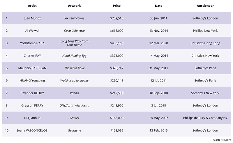 As regards the ceramic works created by Contemporary artists (born after 1945 according to Artprice’s classification), auction records have not been revised for about ten years… a very long time for the segment. During this period, the only artists whose ceramic works have exceeded the $500,000 threshold are Juan MUÑOZ and AI Weiwei, and their records in this category date back to 2011 and 2014 respectively. A whole decade without any new auction price peaks would appear to suggest a lack of demand, but, above all, it reflects a lack of supply… a supply which substantially diminished throughout the decade; the annual volume of ceramic lots sold at auction having shrunk to less than half what it was a decade earlier. In recent years, only about one hundred ceramic works signed by contemporary artists have sold annually at auction, which makes it an extremely marginal category, even rarer than contemporary works in the “textile/tapestry” category, whose transaction volume is six times higher.