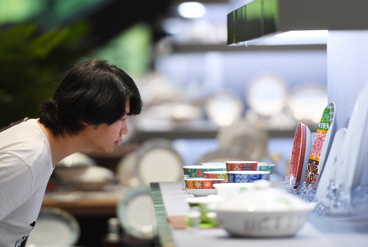 A visitor takes in ceramic products at an exhibition hall in Jingdezhen, Jiangxi province, in August. [Photo by ...