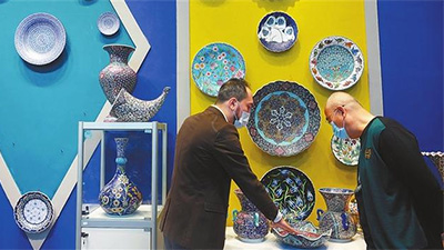 A Turkish exhibitor (L) introduces exhibits to a visitor at the 2021 China Jingdezhen International Ceramic Fair...