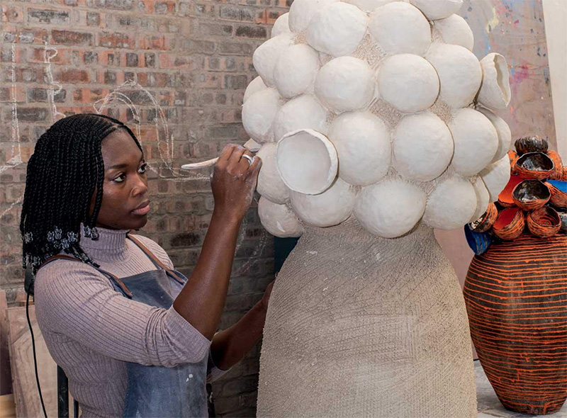 Powsa in her studio, working on her Umthwalo series, inspired by the way local women carry heavy loads on their ...