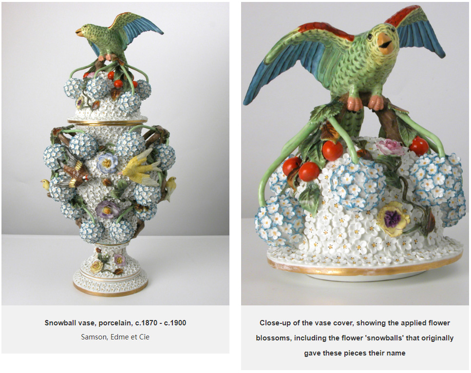 Agatha’s father, Frederick Miller, was an American former partner of a New York department store and purchased a lot of German porcelain. He wasn’t interested in collecting the very early and incredibly rare pieces of German porcelain, however. Rather, he preferred to purchase contemporary pieces, or copies of earlier figures, showing that his interest was in the delight of the objects, not their monetary or collecting value. Two of the largest and most striking pieces in the collection are a pair of ‘Schneeball’ (snowball) vases. Originally, these detailed vases were made in the 18th century at the prestigious Meissen factory in Germany, but the examples at Greenway are 19th-century copies made at the Samson factory in Paris.