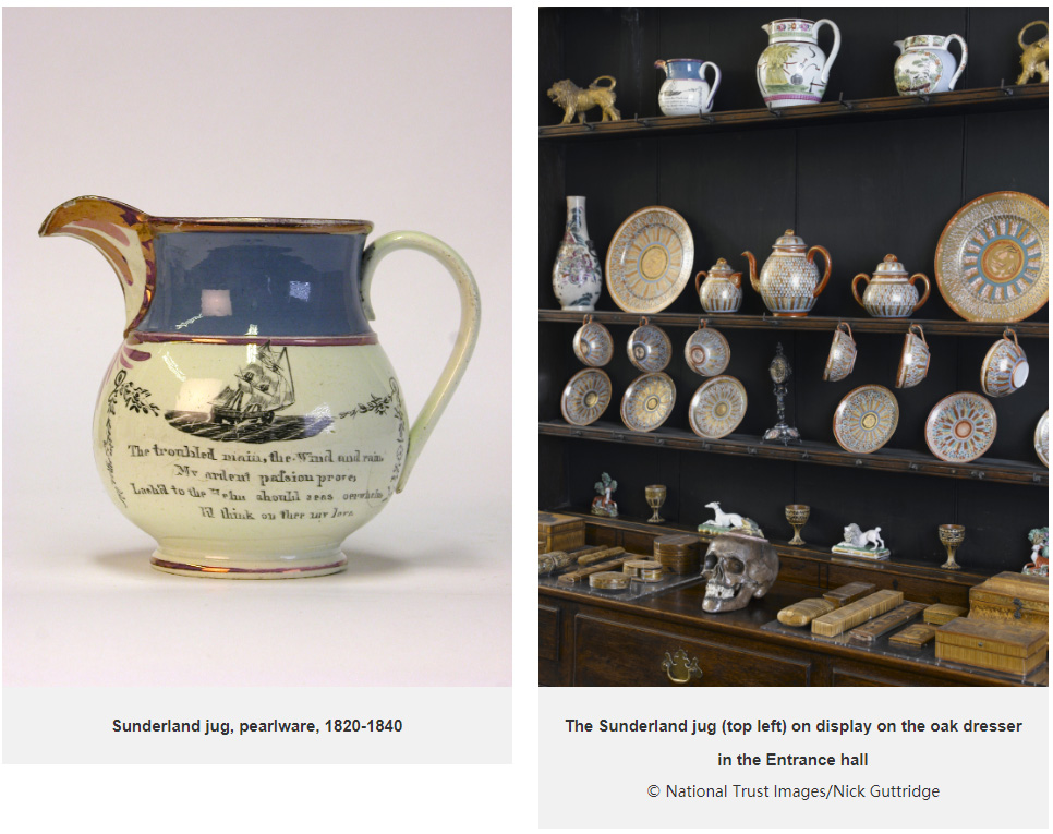 English pottery, much of which dates to the 18th century, also forms part of the collection that was certainly at Greenway by the 1940s. The variety of English pottery bears relation to the collecting approach applied to much of the rest of the collection; some pieces are rare, many are common. Some are decorative figures displayed in cabinets, others are tablewares purchased for use. Examples such as the Sunderland jug, which bears the inscription 'The troubled main, the Wind and rain / My ardent passion proves / Lashed to the Helm should seas oerwhelm [sic] / I'll think of thee my love', appeals to sentimentality but perhaps was collected with anthropological interest.
