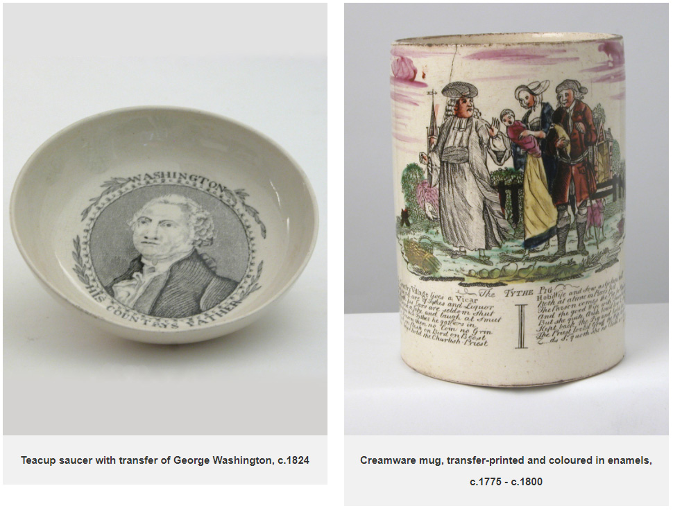 Transfer printed items show a political interest as well as cultural commentary. A creamware cup and saucer with portraits of George Washington and the inscription ‘our country’s father’ date to the 1780s when British potteries started to make wares for the American market - potentially of interest to Agatha’s American father. Another, dating to the 1770s, is a creamware mug printed and hand painted with ‘The Tithe Pig’ after an engraving by Louis Philippe Boitard which provided a commentary on the contentious practice of church tithes.