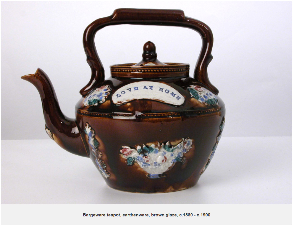 Max also chose to collect a large amount of pottery known as Bargeware (or Measham ware). It was made around Burton-on-Trent though largely sold at a shop in Measham which happened to be by the canal. This kind of ware was favoured by barge and narrow boat owners for its practical and decorative nature. The relative inexpense of this pottery and the ease with which it was made and decorated with impressed and moulded details meant that it was very popular. Often Bargeware pieces are impressed with dates and messages and were frequently given as gifts for weddings or other occasions. Maybe the twee messages appealed to Max and Agatha’s sense of humour? With the collection comprising nearly 50 separate pieces, Max certainly found great interest in them.