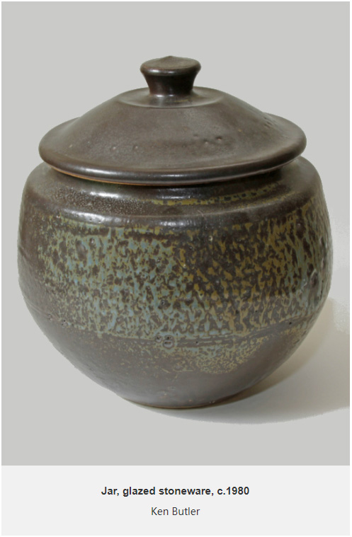 The spread of local potters represented in the collection and the dates of these pieces – collected mostly between the 1970s and 1990s – suggests that the Hicks were buying new pots directly from the potters themselves. They undoubtedly would have visited local exhibitions and perhaps purchased from key galleries including the Devon Guild of Craftsmen (who represented de Trey) at Bovey Tracey. The large pot by Ken Butler was purchased from a gallery in nearby Totnes; the card for ‘Folkcrafts Ltd’ is still inside.