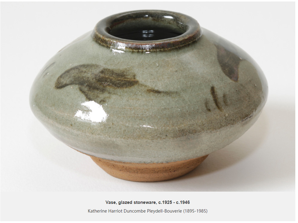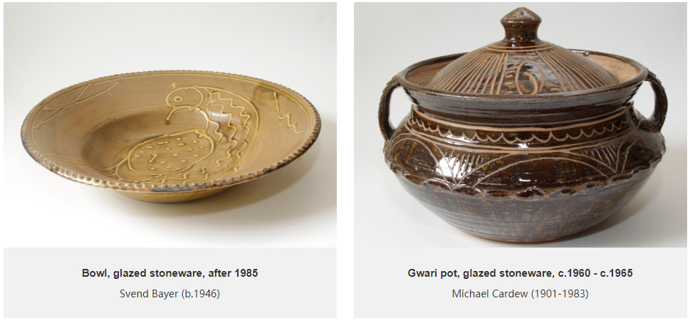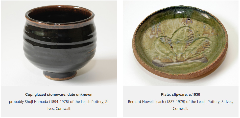 Some of the pieces however, are evidence of a good knowledge of studio pottery and an eye for a good pot. Amongst the collection are some of the key names of the studio pottery movement, from the South West and beyond: Shoji Hamada, Lucie Rie (1902-1995), Norah Braden (1901-2001), Katherine Pleydell-Bouverie (1895-1985) and William Staite Murray (1881-1962). Pieces by these potters may represent a concerted effort by the Hickses to adopt a ‘one of each’ approach to acquiring examples by the key names of the studio pottery movement. These items were almost certainly bought through dealers or at sales; the Hamada pot still retains its auction label. Interestingly, it is the examples amongst these names that constitute the earlier items in the collection, dating to the 1930s. The piece by Katherine Pleydell-Bouverie dates to between 1925 and 1946 when she was based at the Cole Pottery, Coleshill, Wiltshire. One of the Bernard Leach pieces – a slipware plate - is also an earlier example from the St Ives pottery, dating to the 1930s.