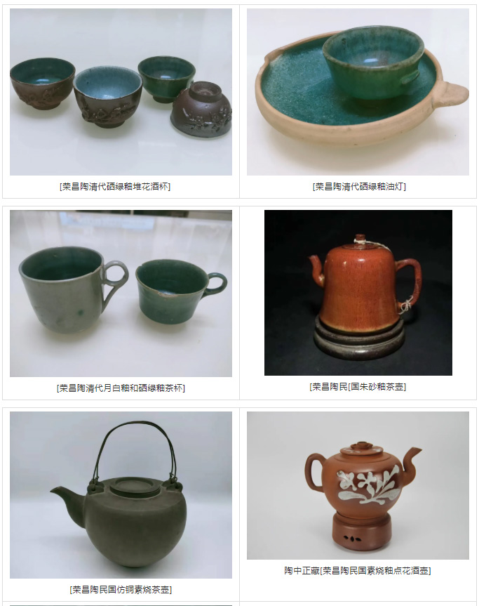荣昌陶到了清朝又是一种不一样工艺特征,在荣昌区安富鸦屿山上,向西北一遍区域黑水凼隆昌荣昌河流两岸,很早就出现了清代的陶瓷产品和窑址。主要是白泥原矿就在本地域,生产的是文具、酒具、烟具、花瓶、茶具、动物、佛教人物、罐类等用具,手拉坯、印坯,白泥为主,施釉十分成熟了,主要有独特几种釉色,硒绿釉、月白釉、朱砂釉、黄釉等,产品十分丰富,硒绿釉、朱砂釉、月白釉特耀眼,装饰浮雕图案,素烧釉点花,十分兴盛。鸦屿山生产,安富五里古街盛世,销售兴旺场面,清朝康熙年间经济发展,安陶几十公里更是一片繁荣盛况,鸦屿山上和山下安富五里长街古窑甚多,下兴窑、上新窑、中兴窑、向家窑、万利窑、肖氏窑、阶梯窑、倒烟囱、龙窑几十座清代古址窑,从出土的产品中可见有一些奢侈大官人家的用具,比如小酒具,小茶具,文具,香炉具,烟具,釉色独特精美,工艺制作都比较精致讲究小巧,呈现出文人和官方的专门用品,因此从产品的呈色可以判断出有一些官窑。