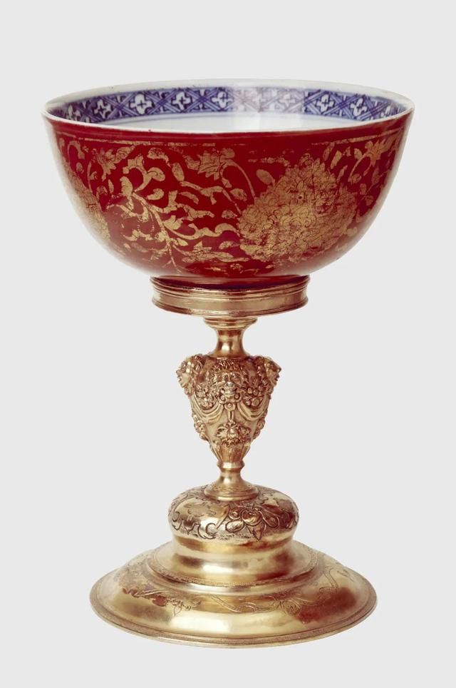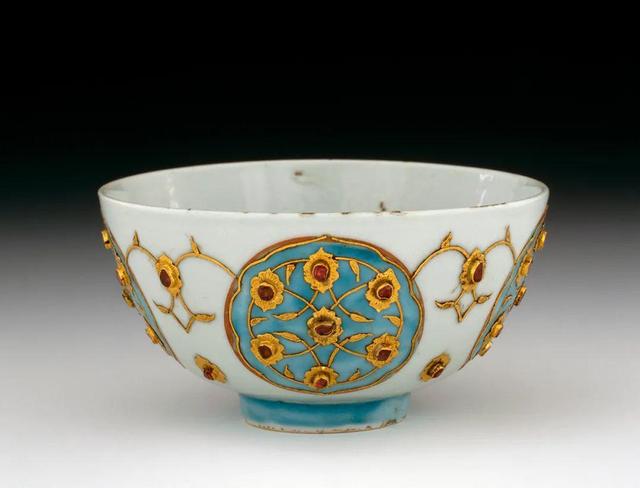 这件碗在16世纪晚期由奥斯曼帝国宫廷匠人镶上黄金和红宝石,这类设计巧妙地利用了碗外壁原有的圆形开光,将奥斯曼的本地装饰风格重映在中国瓷碗上。