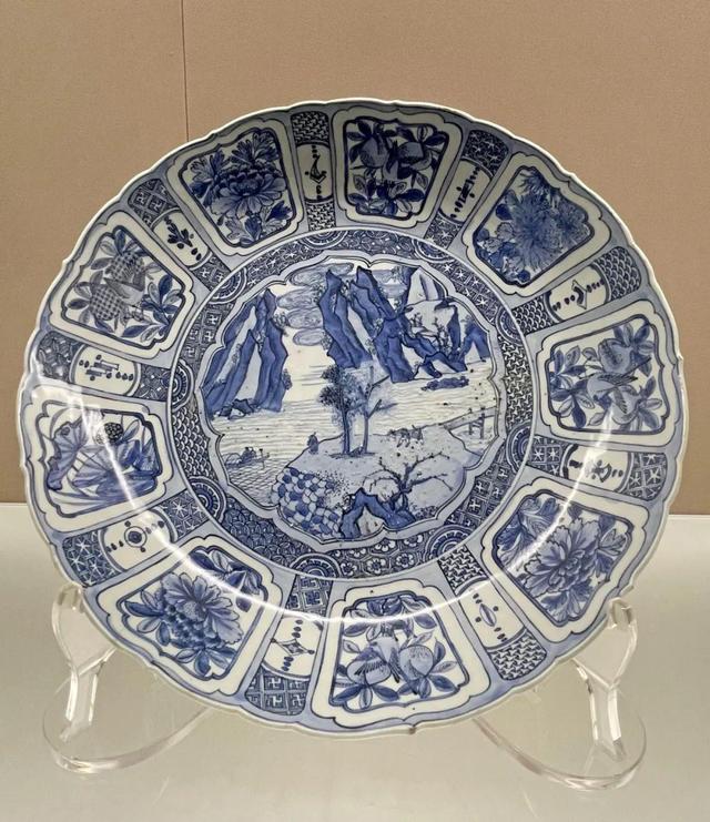 青花开光山水图盘