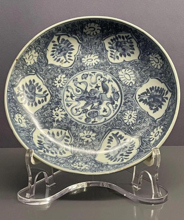 青花开光狮球花卉纹盘