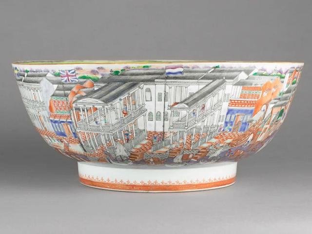 碗外壁描绘了广东十三行的贸易场景,高杆上悬挂的六国国旗,分别为荷兰、英国、瑞典、法国、奥地利、丹麦。