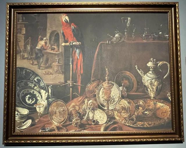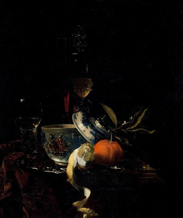 威廉·卡尔夫,巴洛克时期的荷兰画家,出生于鹿特丹,是荷兰黄金时代最杰出的静物画家之一。此画描绘了一张堆满物品的桌子,其中有一件青花盖碗。可能用作糖罐,碗盖斜搁在碗和水果上,有一形似蹲狮的深色盖钮。碗外壁开光内贴塑两个着色的中国人物形象,一说是八仙中的吕洞宾与何仙姑。