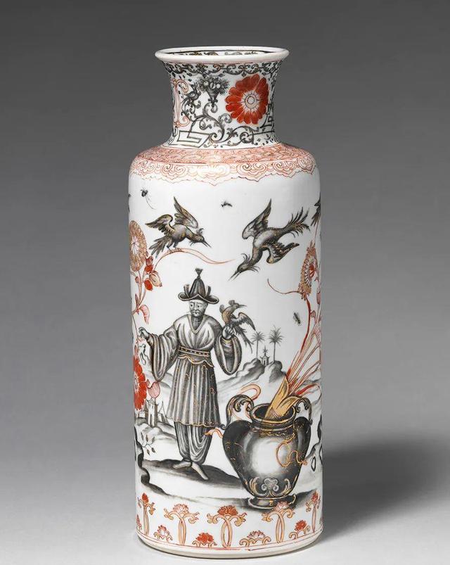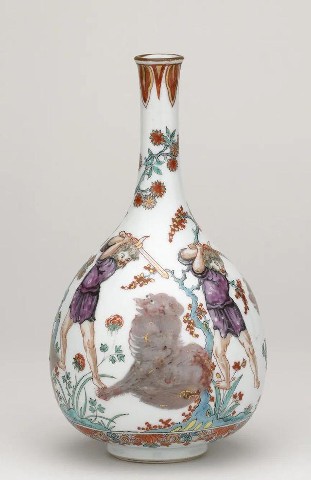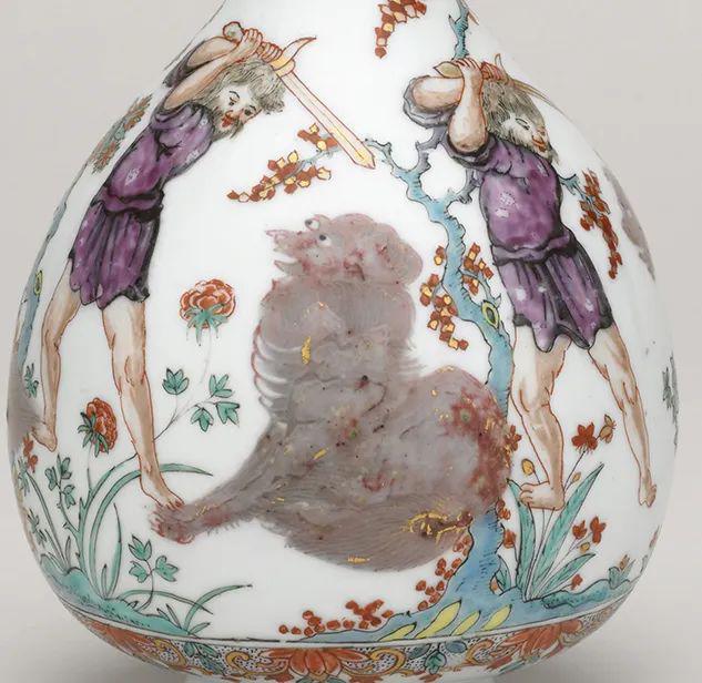 瓶身原以金、红彩绘花卉,是景德镇工匠仿造日本风格,烧制的“中国伊万里”瓷器。大约1729—32年,著名彩绘师伊格纳茨·普莱斯勒(Ignaz Preissler)为其添加了“中国趣味”(chinoiserie)风格的人物。