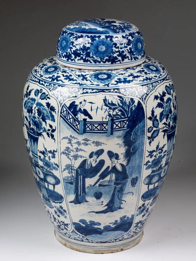 白釉蓝彩博古仕女图盖罐