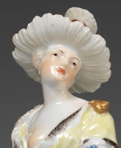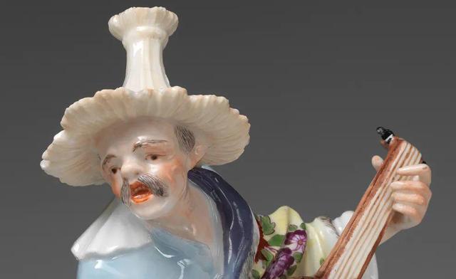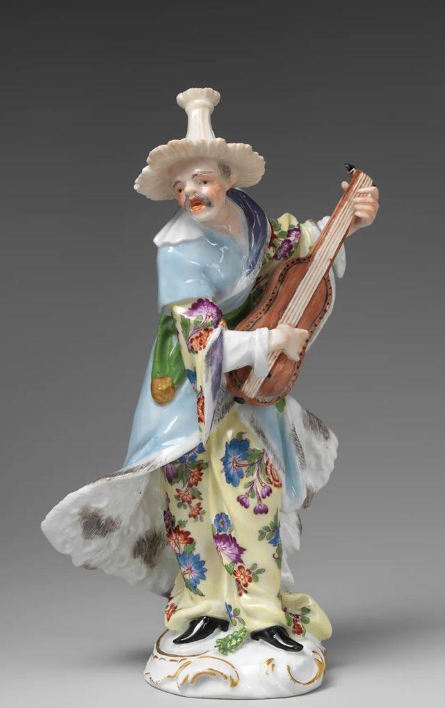 这对中国乐师像是典型的“中国风”瓷塑,男子的胡须,锥形或宝塔形的帽子、宽松的下装都是当时欧洲人眼中的“中国”特征。然而,人物袒露的着装,奔放的姿态,立体的五官,以及使用的乐器,都与当时中国人的实际形象相差甚远,是抽象的东方元素、具象的西方细节,加上想象构建而成的异域风情。
