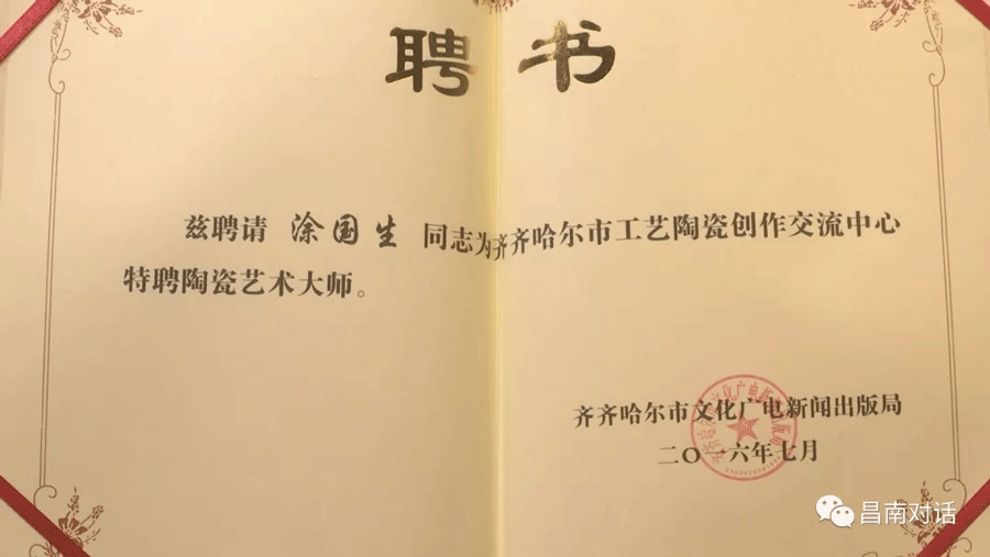 涂国生,中国高级工艺美术师,中国工艺美术学会会员,江西省工艺美术协会会员,江西省高级工艺美术师,擅长高温颜色釉装饰。1989年,毕业于景德镇市陶瓷职工大学美术系;2010年,作品《唐风系列》获中国收藏艺术陶瓷十大名品金奖;2011年,颜色釉镶器《十里茶香》被景德镇中国陶瓷博物馆收藏;2011年,作品《福娃》获第13届中国工艺美术大师精品博览会金奖,次年被中国工艺美术馆收藏;2012年,获景德镇市非物质文化遗产“色釉绘画”代表性传承人荣誉称号;2016年,被齐齐哈尔市文化广电新闻出版局聘为齐齐哈尔市工艺陶瓷创作交流中心特聘陶瓷艺术大师。