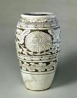 缸唇口,溜肩,深腹,圈足。外壁通体以剔花装饰。其做法是先在灰褐色胎上施一层洁白的化妆土,划出花叶、缠枝牡丹、回纹等纹样,再将花纹以外的地子上的白色化妆土剔掉,露出灰褐色胎,形成深色地子衬托白色花纹的装饰效果。