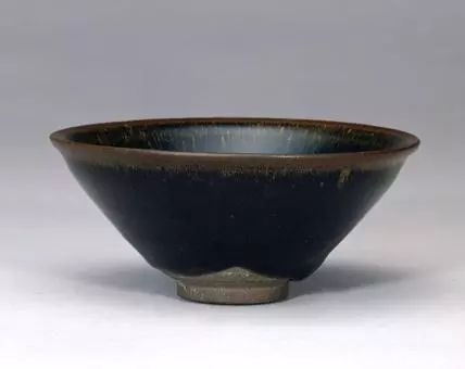 此茶盏为宋代典型的福建建阳窑器物。北宋时期因宫廷盛行斗茶之风,所以这种胎体厚重、釉色漆黑似铁的茶盏流行一时。在这种茶盏的黑色釉面上有呈放射状的黄褐色条纹,似兔身上的皮毛,俗称“兔毫纹”,兔毫纹属于结晶釉的一种。除“兔毫纹”盏外,建阳窑还生产“油滴纹”盏,这些黑釉盏都宋代著名的茶具品种。