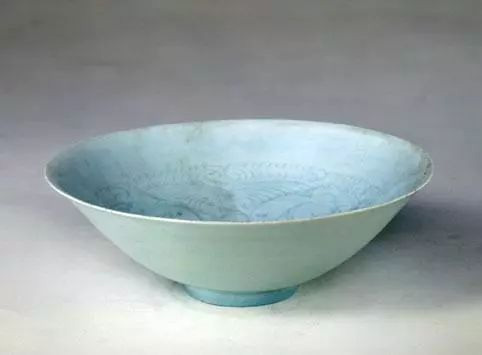 宋景德镇窑烧造的青白釉瓷以生产民间日用瓷为主,饮食具、酒具最多,盒类次之。青白釉青中有白,白中闪青,以介于青白二色之间而名。青白釉瓷胎体轻薄,所印、刻的花纹迎光透视,内外可见。景德镇烧造青白釉瓷的窑厂很多,以湖田窑规模最大,其产品种类丰富,质量精良,最具代表性。此碗即宋代景德镇湖田窑的一件代表作。