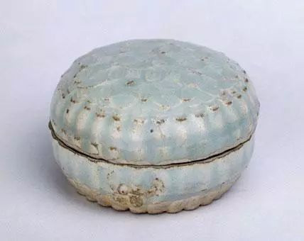 盒呈菊瓣形,子母口,平底,造型精巧别致。盖面印有密集的锦纹,纹饰模糊不清。盒里外施青白釉,施釉不到底,露胎。外底印有“蔡家盒子记”。