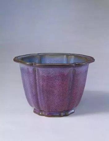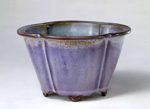花盆六瓣葵花式,折沿,口沿边起棱,深腹,圈足。盆内外施釉,口沿以内呈灰蓝色,外呈玫瑰紫色,口沿下流釉,凸棱处釉薄呈酱色。
