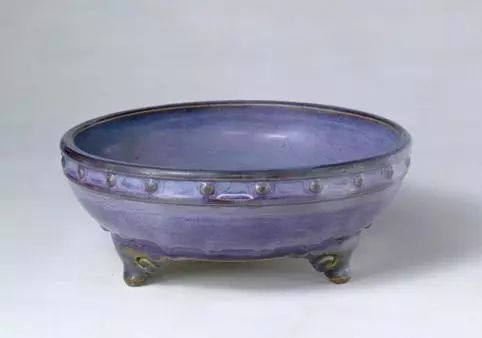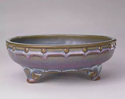 鼓钉洗是钧窑瓷器中常见的造型品种,这种富于装饰性的器物配以如意头形足活泼轻巧,匠心独具。此为宋代宫廷陈设用瓷。