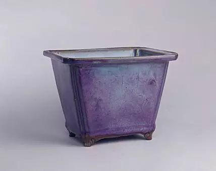 51、钧窑玫瑰紫釉长方花盆,宋,高15cm,口径20—16.5cm,底径13.4—10cm。
