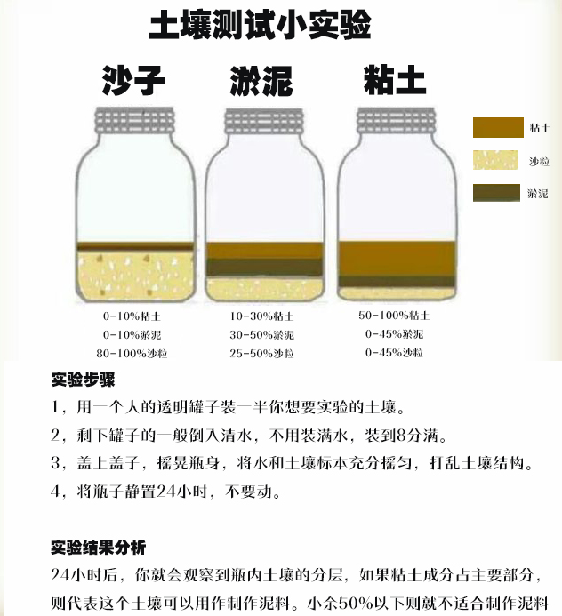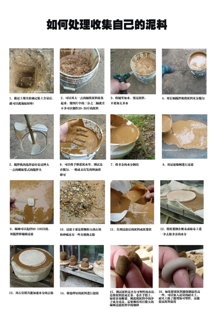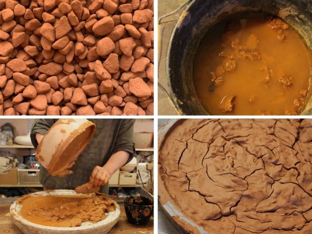 湿加工:将粘土土壤放入桶,倒入一定量的水,浸泡几天后搅拌成泥浆,再用筛网过滤去除大块石块或有机物,如果粘土杂质较多,可能需目数更大的筛网多次过筛。将过滤后的泥料沉淀、去水,倒入编织袋中干燥到适合揉泥的程度,加入12~25%的细砂,同样是避免制作和干燥过程中开裂意外。