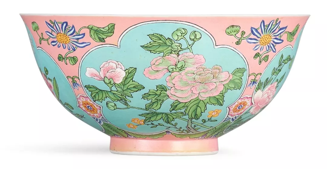 粉红地珐琅彩开光花卉碗