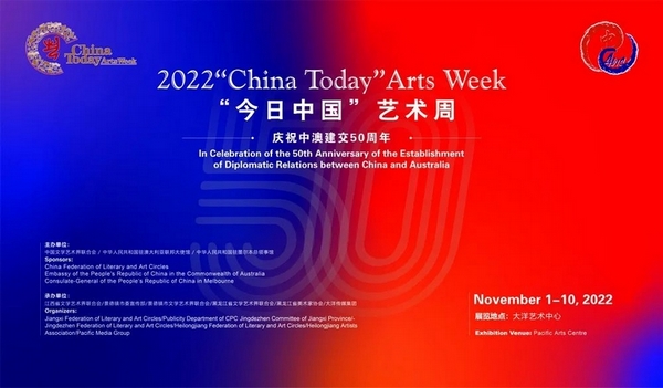 为庆祝中澳建交50周年,2022“今日中国”艺术周于11月3日在澳大利亚墨尔本大洋艺术中心开幕。艺术周(墨尔本站)由中国文学艺术界联合会、中国驻澳大利亚大使馆、中国驻墨尔本总领事馆联合主办,江西省文学艺术界联合会、景德镇市委宣传部、景德镇市文学艺术界联合会、黑龙江文学艺术界联合会、黑龙江省美术家协会、大洋传媒集团承办。