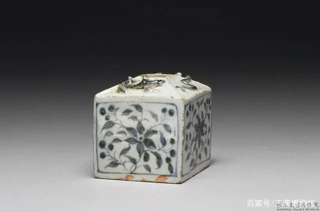 盖面饰两条泥条捏塑的褐色蟠螭,四面各以钴料描绘花卉折枝果纹,近底部与底部露胎无釉。东南亚地区则多出此类小型罐,青料或出于国产,色调泛灰。此类方形小罐亦有青白瓷与釉裡红类型。