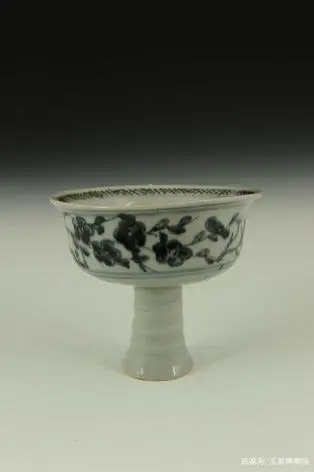 侈口、斜直壁、竹节形高足。外壁光素无纹,内壁口沿饰两道弦纹,一侧用青花绘一枝盛开的梅花,另一侧绘一钩弯月,碗心点六个圆点。胎质洁白细腻,器壁很薄。釉色白中泛青,光亮莹润。此碗造型精巧秀丽,纹饰简洁明快,青花色泽清淡高雅,是元青花中少见的精品。
