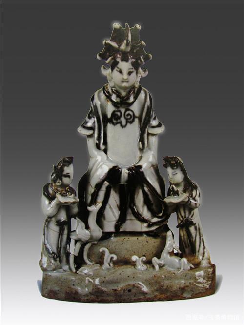施青白釉,釉不及底,底部露胎呈土黄色。观音胸前青花如意纹清晰可见。发、衣领、披肩、衣袖边采用青花褐彩并用施彩。这是一件有明确纪年墓葬出土的元青花观音像,它的出现引起了海内外同仁的关注。它为我国研究早期青花瓷提供了极为珍贵的资料。