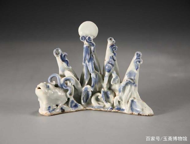 笔架由四座耸入云间的海礁组成,顶端有一轮明月;笔架的左面为鱼蛙形水盂,背上有小孔。全器施青白釉,用青花描绘云朵、波浪、鱼蛙的双眼及部分海礁。构图层析复杂,但处理得当,总体看来给人以素雅宁静之感。