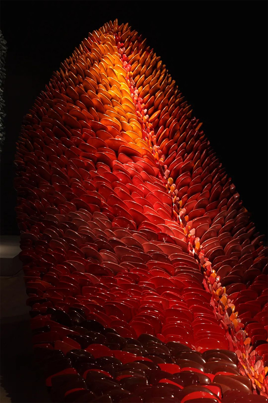 作品以朱砂红主色、橘色间色等红色的渐变,作鳞片状的穿插排布,远观犹如一片燃烧的羽毛。以弧度形态、饱满的色彩以及陶瓷特有的渐变光泽,让坚硬的材质具备了轻柔的力量。