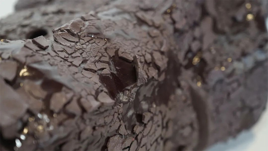 一团黑色的物质,表面起伏缓和,遍布细碎的皲裂。似乎是一节带着树瘤的木块,在亿万年前在山火中被烧成黑炭,又被深深埋藏于地下在高温高压中生长出了这些闪亮深邃的鳞片。这是来自于自然一种特殊的结晶,物质在生命与毁灭之间流转,使有机与无机相互交融,凝结出真正的“天长地久”。