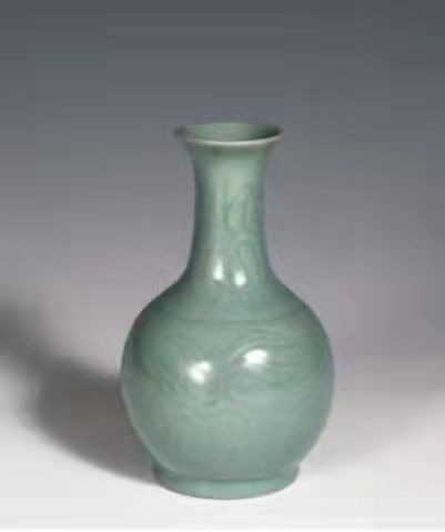 记者走到一樽仿古天蓝釉·花鹅颈瓶前驻足观看。张亚格说:“这个瓶也算是我的代表作,此瓶散口细颈,鼓腹圈足,颈部及腹部剔刻折枝莲花器表满施天蓝釉,釉层匀净莹润。该瓶经过精心打造,造型秀丽釉面光亮,表面进行了原版的刻花装饰。原件在河南博物院收藏,原物汝官窑天蓝釉刻花颈瓶,不但是唯一一件经考古工作者科学发掘所得的器物,而且是唯一一件刻花作品,真是稀世难得。”