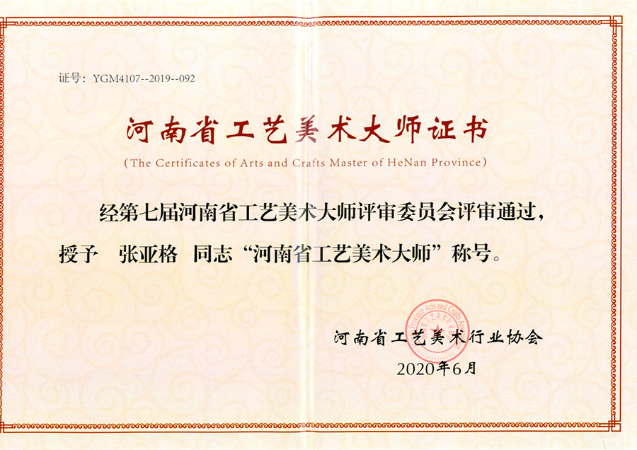 2020年6月,经河南省工艺美术行业协会第七届河南省工艺美术大师评审委员会评审通过,授予张亚格“河南省工艺美术大师”称号。