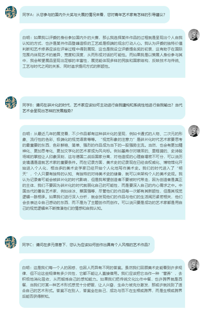 白教授介绍了他的艺术实践。他早年就读于陶瓷专业,但却因油画和综合媒材的“非形式绘画方式”创作而为人所知。这种综合身份让白教授能创作出具有自我面貌的作品。他最初的理想是成为一名画家,但在漫长的从业过程中被陶瓷这种中国的独特语言和审美方式所打动,至今他已经在法国塞努奇博物馆、中国民生美术馆、比利时凯拉米斯陶瓷博物馆等知名博物馆和艺术机构举办个展。同时,白教授也在不断地推动中国现当代陶艺的发展,通过策划、组织展览等方式助力年轻一代艺术家的成长。