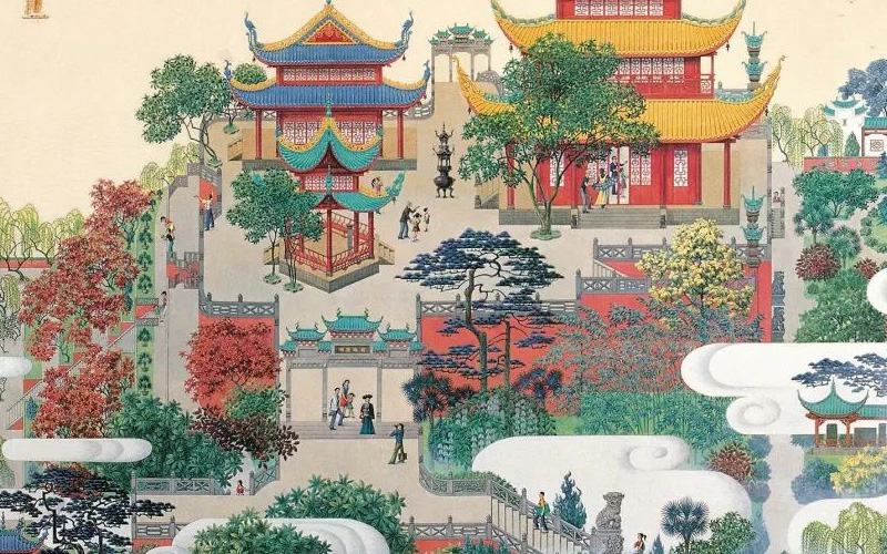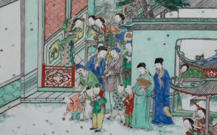 △ 康熙 五彩潘车盈果图盘(局部) 大都会艺术博物馆藏 康熙时期,瓷器绘画...