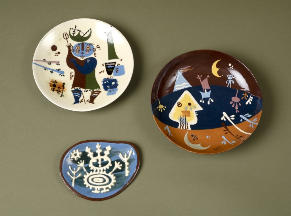 In 1939 he was awarded a scholarship to Edinburgh College of Art, although his studies were soon interrupted by the war. In 1941 he was invalided out of the Army, and in 1943 he resumed his studies in Edinburgh, where he first experimented with pottery in 1945. He relocated to London where he shared a house with the Icelandic art historian Björn Theordor Björnsson. By 1946, he moved to Reykjavik where he was offered a teaching position. Together with the Icelandic artist Gesture Thorgrimsson he built a kiln and prospected for clay, making earthenware pots decorated with coloured slips. Their pottery would become known as ‘Laugarnesleir’, its aesthetic values of form and colour inspired by Inca, Aztec and Mayan pottery, fused with elements of European abstract art.